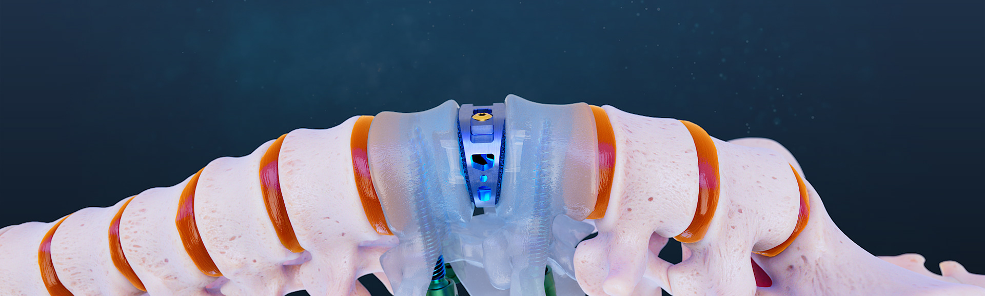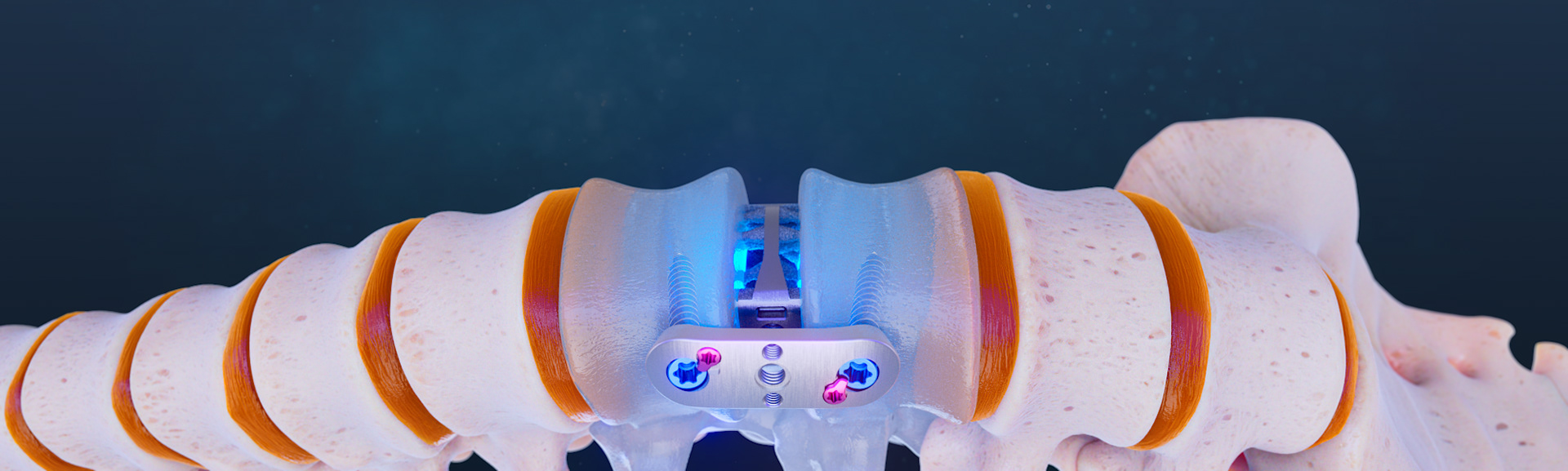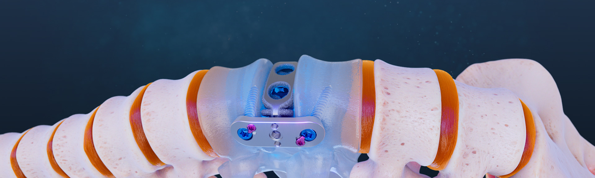 Render of a spine with an ALIF (Anterior) interbody insert in place with translucent bones to show supplemental fixation.